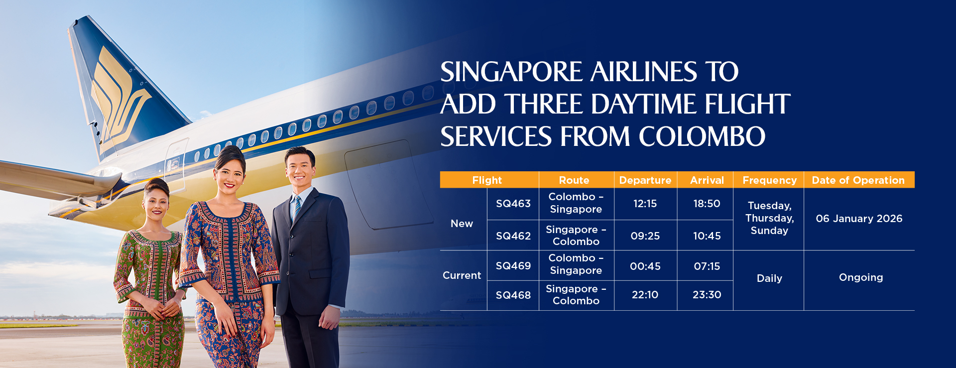 | New | SQ463 | Colombo – Singapore | 12:15 | 18:50 | Tuesday, Thursday, Sunday | 6 January 2026 |